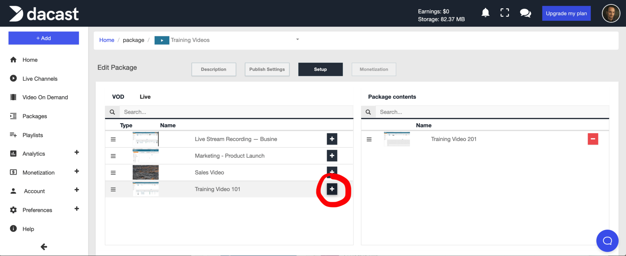However, we’re most interested in the third tab for now: Setup. This tab allows us to add videos to the package. Click the setup tab, and make sure you select VOD. Then, simply use the plus sign buttons to add the training videos to our package. Once we’ve made any other final settings, we can now embed our video on our website.