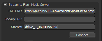 : Escribe el STREAM URL en el campo ‘FMS URL’: rtmp://p.ep195055.i.akamaientrypoint.net/EntryPoint