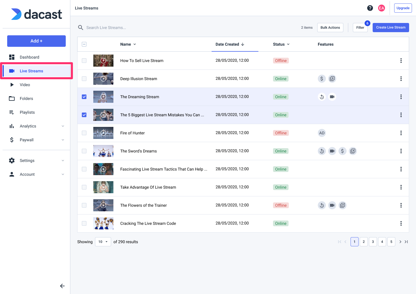 Antes de comenzar su transmisión en vivo, hay que iniciar una sesión en su cuenta de Dacast. Asegúrese de que esté en la sección de Canales en vivo (“Live Streams”).